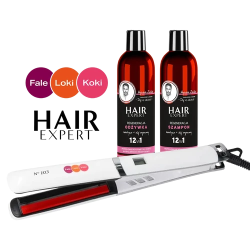 - Zestaw 3w1 do stylizacji i odbudowy: prostownica Fale Loki Koki N103 Premium wygładza i pozwala tworzyć fale oraz podkręcać końcówki, a szampon i odżywka Hair Expert Regeneracja 280 ml wspierają regenerację, poprawiają miękkość, ułatwiają rozczesywanie.